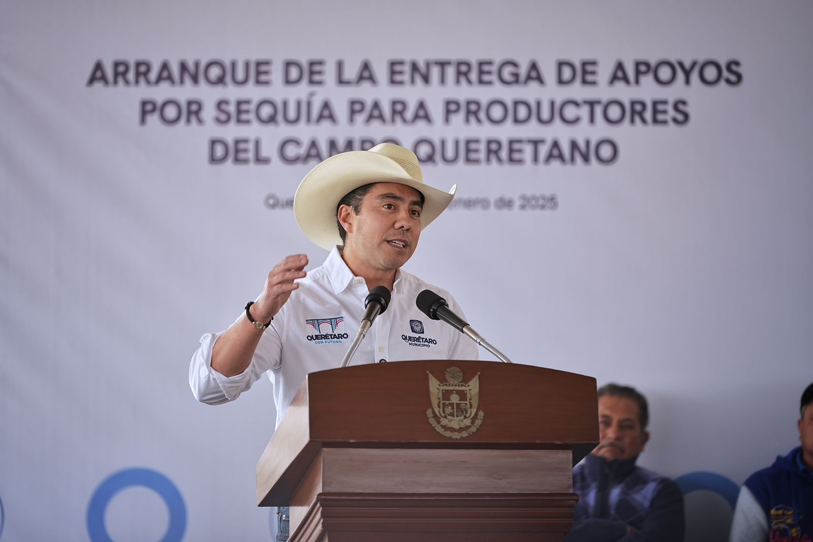 * El presidente municipal de Querétaro, Felifer Macías, acompañó al gobernador del estado, Mauricio Kuri González, a la entrega de apoyos por sequía para productores del campo queretano, que se realizó en la explanada del Lienzo Charro en la Delegación Santa Rosa Jáuregui.