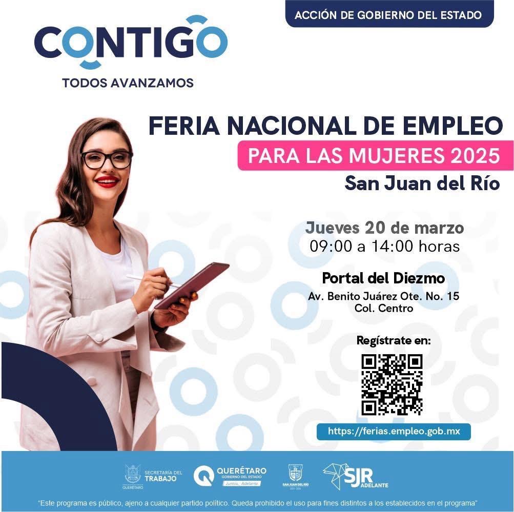 La secretaria del Trabajo en el estado, Liliana San Martín Castillo, informó que ya está todo listo para la Feria Nacional de Empleo para las Mujeres en el municipio de San Juan del Río, que se realizará el próximo 20 de marzo, de 9:00 a 14:00 horas, en el Portal del Diezmo. En este evento se ofertarán más de 700 plazas vacantes en colaboración con 35 empresas de los sectores industrial y de servicios.