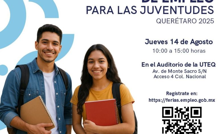 La Secretaría del Trabajo (ST), que encabeza Liliana San Martín Castillo, invita a la ciudadanía a participar en la Feria Nacional de Empleo para las Juventudes 2025 donde se ofertarán más de mil vacantes, el próximo 14 de agosto en el auditorio de la Universidad Tecnológica de Querétaro UTEQ, ubicada en la colonia Nacional en un horario de 10:00 a 15:00 horas.